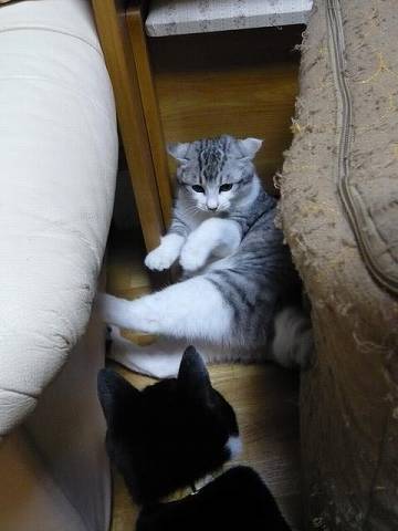 ☆チョコさま いつもありがとうございま~す(^_^)v ホントです、最初は、2にゃんなんて、わたしには無理ぢゃないか?ともったんですが、星子さんのアドバイスのとおりでした(^.^) みつしまふたりの違いを観察してると面白いんですよね~ププッ この写真は、みつに追い詰められてるしまです(^_^;) *みつしまは県南におります(^v^)